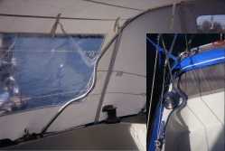 bestehen aus zwei Teilen 1. Die am Persenning befindlichen Klarsichtdreiecke mit integrierter Oese 2. Aufroller bestehend aus einem 40 mm breitem Gummiband mit 2 Haken. Die breiten Aufroller schützen die Plane vor Scheuer- und Druckspuren im Fensterbereich.