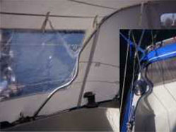 bestehen aus zwei Teilen 1. Die am Persenning befindlichen Klarsichtdreiecke mit integrierter Oese 2. Aufroller bestehend aus einem 40 mm breitem Gummiband mit 2 Haken. Die breiten Aufroller schützen die Plane vor Scheuer- und Druckspuren im Fensterbereich.